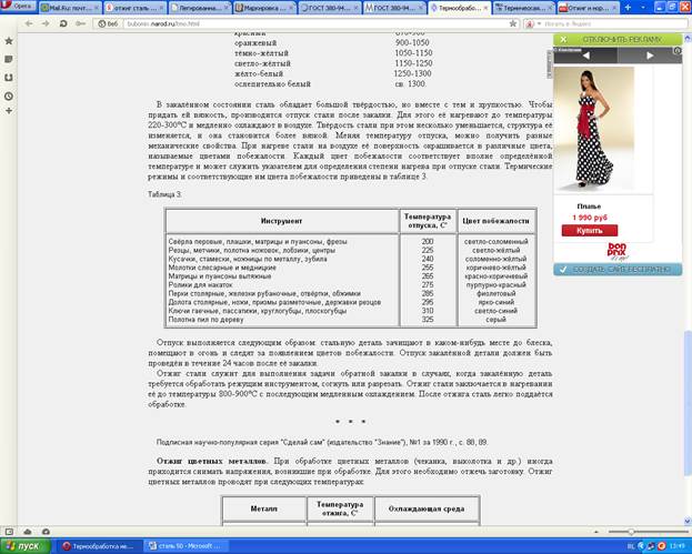 В закалённом состоянии сталь обладает большой твёрдостью, но вместе с тем и хрупкостью. Чтобы придать ей вязкость, производится отпуск стали после закалки. Для этого её нагревают до температуры 220-300°С и медленно охлаждают в воздухе. Твёрдость стали при этом несколько уменьшается, структура её изменяется, и она становится более вязкой. Меняя температуру отпуска, можно получить разные механические свойства. При нагреве стали на воздухе её поверхность окрашивается в различные цвета, называемые цветами побежалости. Каждый цвет побежалости соответствует вполне определённой температуре и может служить указателем для определения степени нагрева при отпуске стали. Термические режимы и соответствующие им цвета побежалости приведены в таблице 3. Отпуск выполняется следующим образом: стальную деталь зачищают в каком-нибудь месте до блеска, помещают в огонь и следят за появлением цветов побежалости. Отпуск закалённой детали должен быть проведён в течение 24 часов после её закалки. Отжиг стали служит для выполнения задачи обратной закалки в случаях, когда закалённую деталь требуется обработать режущим инструментом, согнуть или разрезать. Отжиг стали заключается в нагревании её до температуры 800-900°С с последующим медленным охлаждением. После отжига сталь легко поддаётся обработке.