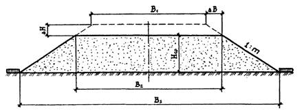 Рис.3 Схема к расчету Hср Путем несложных математических исследований рис.3 можно вывести формулу длярасчета Hср: Hср = Поскольку ΔВ= m то В2=В1+2m Исходя из технической категории В1= 12 м ΔH принимаем равной суммарной толщине дорожной одежды, то есть ΔH= 0,06 + 0,17 + 0,18 + 0,20 = 0,61 м Коэффициент заложения откоса принимается по типовым проектам ( в данномслучае m = 4). Тогда по формуле (15): B2= 12 + 2 По формуле (13): Hср = Hср = B3 = 16,88 + 2 Для проверки достоверности результата подставим его в формулу Fтр= Где Fтр – площадь поперечного сечения трапеции (см рис. 2), м2. Fтр= Сравнивая результаты расчетов по формулам (12) и (16), приходим к выводу, что погрешность составляет: 19,91 – 19,89 = 0,02 м2, что вполне допустимо и объясняется округлениями при выполнении расчетов. Проведение расчетов с точностью до 8 - 9 знаков после запятой подтверждает этот вывод. Если по заданию поперечный профиль дорожной одежды корытный, то обочины досыпаются сразу, в процессе сооружения земляного полотна, и расчет Hср, производится по-иному. Hср = где B – проектная ширина земляного полотна, м; m – коэффициент заложения откоса; b – ширина корыта, м; h – толщина дорожной одежды, м; b0 – ширина обочины за вычетом ширины укрепительной полосы, м; h0 – толщина укрепления обочины, м. Проверка же правильности расчета производится по формуле F = mHср2 + B Hср – b h - 2 b0 h0, м2 (18)