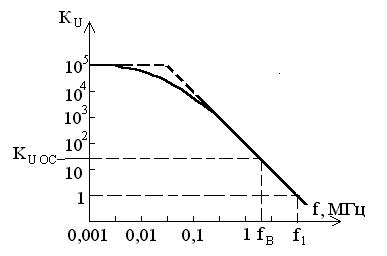 Аналогично получим RВХ=UВХ/IВХ=R1+R2/(KU+1). Пренебрегая вторым слагаемым, получим RВХ ОС» R1. А RВЫХ ОС = RВЫХ/(1+ KU/ KU ОС). АЧХ инвертирующего усилителя приведена на рисунке 2.9. Если выполняется условие KU>> KU ОС, получаем f1»fВ× KU ОС.