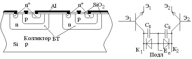На рисунке 4.1а представлен фрагмент ППИМС с двумя биполярными транзисторами и с изоляцией обратно смещенными pn-переходами. На рисунке 4.1б представлена эквивалентная схема этого фрагмента. На подложку подается наибольшее отрицательное напряжение от источника питания, поэтому pn-переходы между коллектором БТ и подложкой оказываются запертыми и транзисторы изолированы друг от друга. Однако следует отметить, что обратно смещенные pn-переходы обладают барьерной емкостью СБ и с увеличением частоты возрастает паразитная связь между элементами схемы.