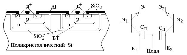 При таком методе изоляции (рисунок 4.3а) элементы схемы отделены друг от друга слоем двуокиси кремния. Паразитная емкостная связь между элементами CП значительно меньше, чем в первом случае, так как диэлектрическая постоянная двуокиси кремния ниже, чем у кремния. Производство таких ИМС более трудоемкое, чем в предыдущих.