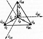 Рис.5.1 Рис.5.2 Соединение, при котором концы фаз потребителя объединяют в общую точку п, называемую нейтральной точкой, а начала фаз подсоединяют к трехфазному источнику питания посредством линейных проводов, называется соединением звездой (рис.5.2). Токи Ia, Ib и Iс в соответствующих линейных проводах называются линейными, токи, протекающие по фазам, — ф а з н ы м и, а ток In в нейтральном проводе — нейтральным. При рассмотрении трехфазной системы считают, что трехфазный источник является симметричным, фазные напряжения которого равны между собой и сдвинуты по фазе относительно друг друга на угол 2 Из схемы рис. 5.2 видно, что при соединении потребителя звездой по его фазам протекают те же токи 1 а, 1 в и 1 с, что и по линейным проводам: фазные токи оказываются равными соответствующим линейным токам: Iф = I.л При этом по первому закону Кирхгофа для нейтральной точки п можно записать 1А + 1В + 1С = In При соединении потребителя звездой, независимо от величины и характера сопротивлений его фаз, а также от того, имеется или отсутствует нейтральный провод, между линейными и фазными напряжениями потребителя существуют соотношения, полученные по второму закону Кирхгофа: Uав=Uа –Uв, UBC=Ub - Uc, Ucа=Uc - Ua Нагрузка, при которой сопротивления всех фаз потребителя равны между собой {Zа,=Zb=Zс), называется симметичной При этомRa=Rb=Rc Ха =Хb=Хс; Uab = Ubc =Uca Сопротивления линейных проводов обычно малы и ими можно пренебречь. Линейные напряжения генератора равны линейным напряжениям потребителя, фазные напряжения генератора равны фазным напряжениям потребителя. При этом, линейные напряжения потребителя, как и фазные, сдвинуты относительно друг друга на угол 2л/3 (рис5.3)