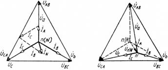 Рис 5.4. Рис. 5.5 При отключении нейтрального провода потенциал нейтральной точки п потребителя не равен потенциалу нейтральной точки N генератора. При этом нейтральная точка п на векторной диаграмме потребителя сместится из своего первоначального положения в другое (пi), при котором геометрическая сумма фазных токов потребителя равна нулю: 1а+1в+Iс=0. В этом случае векторная диаграмма принимает вид, представленный на рис.5.5, Как видно,при несимметричной нагрузке в трехфазной системе без нейтрального провода фазные напряжения потребителя оказываются не равными друг другу. При этом на одних фазах может быть напряжение пониженное, на других — повышенное, по сравнению с фазными напряжениями генератора, В этом случае между фазными токами, напряжениями и сопротивлениями существуют те же соотношения, обусловленные законом Ома, что и при симметричной нагрузке. Частные случаи работы трёхфазной цепи - замыкание или обрыв одной фазы нагрузки рассмотреть самостоятельно.