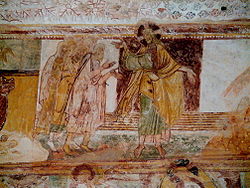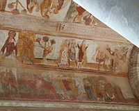 Фрески, составившие славу церкви, были созданы в XI—XII веках. Использованные цвета малочисленны, в основном жёлтая охра, красная охра и зелёный, смешанные в различных пропорциях с белым и чёрным (в небольшом количестве присутствует голубой цвет, пигмент которого был очень дорогостоящ в то время). Живопись покрывает свод главного нефа, нартекс и крипты. На своде центрального нефа фрески располагаются в два яруса, по обоим склонам. Роспись крипт более тщательная. В создании фресок приняли участие несколько мастеров местной живописной школы. К характерным особенностям стиля относятся плоскостные изображения, разномасштабность фигур; иногда ноги и голова персонажей повернуты в разные стороны, из-за чего позы кажутся неестественными. Сюжеты росписей не ограничиваются библейскими сценами — некоторые фрески иллюстрируют эпизоды из басен Эзопа, однако большая их часть иллюстрирует эпизоды ранней ветхозаветной истории — «Сотворение людей», целый цикл, посвящённый Всемирному потопу и Ною, «строительство Вавилонской башни», «Бог говорит к Аврааму», «Авраам и Лот», «Похороны Авраама», «Иаков благословляет Иосифа», «Братья продают Иосифа в рабство», «Переход через Красное море», «Бог дарует Моисею скрижали» и др. Фрески цикла про Ноя и Всемирный потоп: