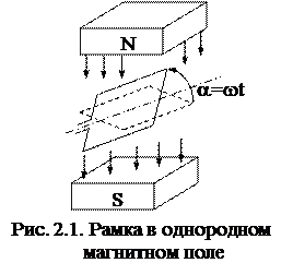 Пусть в момент времени t = 0 рамка расположена горизонтально и как видно из рис. 2.1 магнитный поток, пронизывающий площадь рамки будет максимальным Фm. Если рамку повернуть на некоторый угол