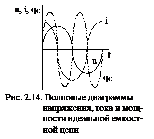 мгновенная мощность в емкостной цепи также как ток и напряжение есть синусоидальная величина, изменяющаяся с удвоенной частотой по отношению к току и напряжению. Волновые диаграммы напряжения, тока и мощности, приведенные на рис. 2.14, показывают, что мгновенная мощность положительна только в нечетные четверти периода, когда ток и напряжение имеют одинаковое направление. В эти промежутки времени энергия от источника поступает в приемник, где накапливается в электрическом поле.