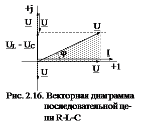 Как видно из 2.52, если ХL > XC, то u= Umsin ( Если XL < XC, то u= Umsin ( а цепь будет носить емкостный характер. Наконец, если XL = XC, то u= Umsin а цепь будет носить активный характер. В соответствии с уравнениями 2.46, 2.48 на рис. 2.16 построена векторная диаграмма в предположении, что XL > XC. Выделенный на диаграмме треугольник называется треугольником напряжений, из рассмотрения которого вытекает