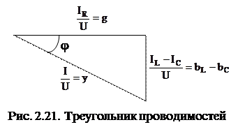 Разность между индуктивным током IL и емкостным током IC называется реактивным током и обозначается IP. Поделив все стороны треугольника токов на напряжение, получим треугольник проводимостей (рис. 2.21), из которого следует полученная ранее формула модуля комплекса полной проводимости