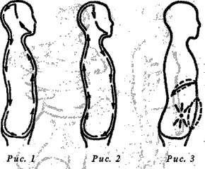 Когда человек дышит низом живота, он находится в исключительно выгодном положении для оптимизации диафрагменного дыхания. На рисунке это хорошо видно. Дыхательные упражнения могут выполняться в любой из трех поз: стоя, сидя и лежа. Главное при этом добиться самопогружения, что составляет основу аутогенной тренировки. В принципе все позы равноценны, хотя у каждой есть свои особенности. Какую из них выбрать? Это зависит от состояния нашего здоровья. Люди покрепче, поэнергичнее предпочитают заниматься стоя, более слабые - сидя, совсем ослабленные - лежа. Вместе с тем у позы стоя есть свои достоинства, которые делают ее предпочтительней для многих. Если вы, например, занимаетесь где-нибудь на природе, у вас нет ни стула, ни твердой дощатой поверхности, чтобы выполнять дыхательные упражнения сидя или лежа. В положении стоя не нарушается система кровообращения, дыхание хорошо массирует брюшную полость. Оно, как мне представляется, особенно активизирует венозное кровообращение. Эта поза дает возможность сопровождать дыхание дополнительным движением.