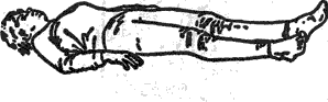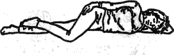 Очень интересной можно считать позу лежа на боку. Она создает хорошие условия для отдыха, для полного расслабления. Если вам неудобно лежать, вытянув руку (рис. 11), может быть удобнее положить ее сзади, уперев ладонь в пол. Другая согнута в локте и подложена под голову. Лежать надо с полузакрытыми глазами, иначе можно уснуть. Самоконтроль дыхания в позе лежа на боку можно осуществлять так, как показано на рис. 12. Если у вас в полости носа избыток слизи, и вы не можете дышать какой-то одной ноздрей, ложитесь дышащей ноздрей книзу, тогда другая освободится. Люди, страдающие заболеваниями сердца, должны ложиться только на правый бок и ни в коем случае на левый. Если после еды у вас долго не опорожняется желудок и вы испытываете тяжесть, ложитесь на правый бок.