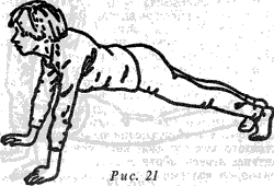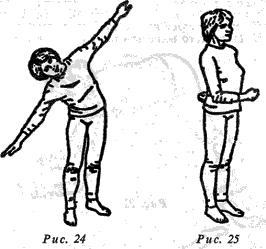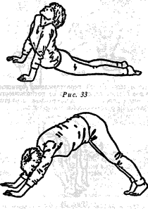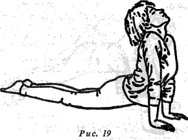 Когда вы встали с постели, а это, надеюсь, произойдет рано, еще до восхода солнца, у вас останется время на небольшую суставную гимнастику. Она может быть самой различной: или упрощенной донельзя, или усложненной в зависимости от достатка времени. Привожу здесь одно из них - для тазовой области. Последовательность его выполнения достаточно хорошо видна на рисунках. Первая поза носит название «поза собаки» (рис. 19). Чтобы сделать ее правильно, необходимо предельно расслабится. Из этой позы вы плавно переходите в последующие (рис. 20,21, 22). Завершаете комплекс упражнением, показанным на рис. 23. Оно заключается в попеременном поднимании выпрямленных ног. Еще более простое упражнение для плечевого пояса, которое вы видите на рисунках 24 и 25. В первом положении человек при полном расслаблении как бы «повисает» на прямых руках, разведенных в стороны на уровне плеч, а затем, сжав пальцы в кулаки, как показано на рис. 25, резко переходит во второе положение, отводя одну руку за спину, а другую держа перед животом. Если человек более подготовлен и располагает лишней минутой времени, то совсем неплохо сделать классический комплекс упражнений, который называется «поклонение солнцу» (рис. 26 - 38).