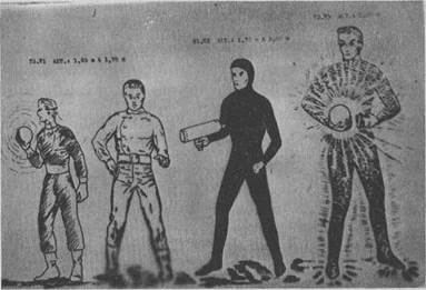 Одежда Без скафандров. Очевидно, без одежды. В 1-м случае – одежда, похожая на сутану. Вооружены «трубками», испускающими ослепляющие вспышки. Внешность Сплошь покрыты шерстью, включая лицо. Глаза большие. Поведение В 3-х случаях – бегство. В 2-х случаях – дружеское. В 2-х случаях – враждебное. В 2-х случаях – разговор на непонятном языке. В дыхательных масках (наподобие противогазов), всё тело облечено в костюм (тоже противогазного типа). Встречались в странах: в Иране, Австралии, США, Бразилии. 2 случая – рост 1 м 70 см – 2 м. 2 случая – маленького роста. Поведение В 2-х случаях – дружественное. В 2-х случаях – враждебное. В 1-м случае – разговор по-английски. В 1-м случае – разговор по-португальски. Все в скафандрах, маленького роста. 24 случая, 32 инопланетянина. Тип 8, вариант 1 Наблюдались в странах: во Франции, Бразилии, США, Канаде, Чили, Италии, на островах Индийского океана. Всего 14 случаев. Рост 90 см – 1 м 20 см. Одежда и внешность. В скафандрах, как уже было сказано. В тех случаях, когда через шлем свидетелям удаюсь увидеть лицо – кожа была в одних случаях белая, в других темная. В 1-м случае группа гуманоидов включала белокожих и темнокожих. Поведение Обычно – бегство. В 2-х случаях – дружеское поведение. В 1-м случае – диалог по-английски. Тип 8, вариант 2 Бразилия, Франция, Италия, Германия, США. 10 случаев. Рост 1 м–1 м 60 см. Одежда и внешность Скафандр (нижняя часть которого напоминает комбинезон). На груди лампа. Носят оружие (кроме 2-х случаев) в виде палкоподобной трубки, но это оружие употреблено не было. Фонарь же в роли оружия употреблялся. Поведение. Бегство или агрессия. Пучком света вызывали паралич (1 случай) или потерю сознания (1 случай).