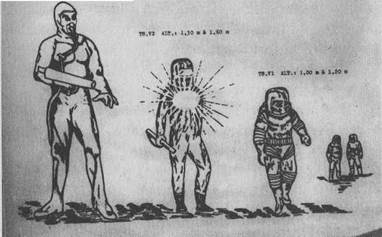 В 3-х случаях на голове был светящийся предмет. Оружия не носят. Внешность Только один глаз. Голова нормальная, лысая. Но в одном случае – длинные волосы. Носа нет, ушей нет. В 1-м случае глазные зубы ненормальной длины. В другом случае – кожа красная. Поведение Дружеское, даже когда свидетели на них напали (в 2-х случаях), но руки нападавших были парализованы неведомой силой без видимого применения какого-либо оружия. Очень высокого роста, до 3 м, в скафандрах. Аргентина, Португалия, Шотландия, Англия. 5 случаев, 11 инопланетян. Рост от 2 м 40 см до 5 м. Одежда Скафандры – прозрачные, металлические, блестящие, светящиеся. Внешность Тело нормальных пропорций, но, повторяем, очень высокий рост. Поведение Дружеское. 1 случай диалога. Тип 13 (новый тип) Наблюдались в трёх случаях в Перу в 1965 г. и в Аргентине в 1969 г. два случая, всего 12 инопланетян. Рост 80 см. Одежда Без скафандров. Внешность Одноглазые. Без оружия. В одном случае длинные волосы. Поведение Безразличное. Никакой беседы.