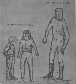 3 случая разговора на непонятном языке. В скафандрах, рост 2 м – 2 м 50 см, глаза круглые. Аргентина, Бразилия, США. 4 случая, 11 инопланетян. Одежда Скафандры прозрачные или блестящие. В одном случае оружие (трубка), но не употреблялось. Внешность
