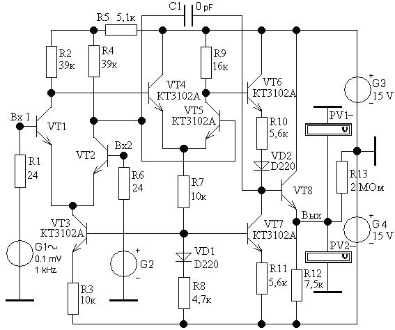Рисунок 1 – Принципиальная схема ОУ на БТ На вход 1 подается напряжение от генератора переменного напряжения G1. Этот сигнал используется для измерения коэффициента усиления ОУ, входного и выходного сопротивлений, а так же для снятия АЧХ усилителя. На вход 2 подается постоянное напряжение от генератора G2. Этот сигнал необходим для снятия характеристики прямой передачи и балансировки усилителя. Вспомогательные резисторы R1 и R6 в состав усилителя не входят, они используются для определения входного сопротивления усилителя. Вторым каскадом так же является дифференциальный усилитель на транзисторах VT4-VT5. Назначение транзисторов VT6-VT7 осуществить сдвиг уровня сигнала для получения на выходе ОУ постоянного напряжения близкого к нулю. Эмиттерный повторитель на транзисторе VT8 необходим для получения малого выходного сопротивления. Диоды VD1 и VD2 служат для температурной стабилизации. При помощи нагрузочного резистора R13 определяем выходное сопротивление ОУ. Конденсатор С1 служит для коррекции АЧХ. Вольтметрами PV1 и PV2 измеряется постоянное и переменное напряжения на выходе ОУ соответственно. На рисунке 2 представлена принципиальная схема ОУ, у которого дифференциальная пара первого каскада выполнена на полевых транзисторах, что позволяет получить большое входное сопротивление усилителя. Второй и последующие каскады выполнены по той же схеме, что и в первом усилителе.