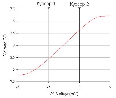 5.10 Исследовать ОУ2, собранный в соответствии со схемой, изображенной на рисунке 2. Для этого из папки ″Исслед. ОУ″ открыть файл ″Рисунок 2″. 5.11 В соответствии с вариантом, заданного преподавателем, установить тип ПТ дифференциального каскада VT1 и VT2, а так же БТ эмиттерного повторителя VT8 из таблицы приложения А. 5.12 Снять характеристику прямой передачи ОУ2 UВЫХ = F(UВХ2). Переменное напряжение сигнала при этом отсутствует UВХ1=0. Характеристику получают методом экспресс анализа следующим образом: в меню EWB выберите опцию Analysis. В открывшемся списке выбрать Parameter Sweep… В окне установить следующие значения: Component - V4: это источник напряжения подаваемого на вход 2; Start Value: -10 мВ начальное значение входного напряжения; End Value: +10 мВ конечное значение входного напряжения; Sweep type – Linear: линейное изменение входного напряжения при анализе; Increment Step Size: 1- приращение входного напряжения при одном шаге; Output Node -19: это точка соответствующая выходу; Sweep for – DC Operating Point: расчет цепи по постоянному току. Выполнить команду – Simulate. На выведенном графике с помощью двух курсоров (рисунок П.1) можно определить входные напряжения х1 и х2, выходные напряжения у1 и у2, а также разницу dх= х1 - х2 и dу= у1 - у2. Кроме того, можно определить максимальные (max) и минимальные значения (min) х и у. Результаты измерений занести в таблицу 4. Таблица 4