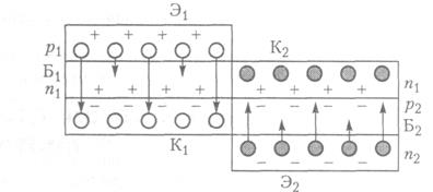 Рисунок 1. Структурная схема динистора. В данном случае большая часть внешнего напряжения приложена к среднему переходу, имеющему большое сопротивление, и только незначительная часть этого напряжения приложена к крайним переходам, сопротивление которых мало. Для того чтобы осуществить переключение, то есть открыть динистор, необходимо скомпенсировать потенциальный барьер среднего перехода. Для более наглядной иллюстрации происходящих процессов в динисторе представим его в виде двух биполярных транзисторов р-n-р- и n-р-n - структуры.