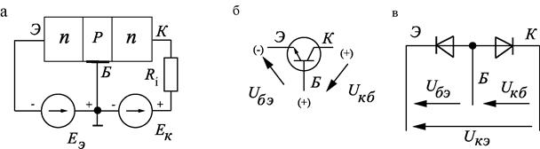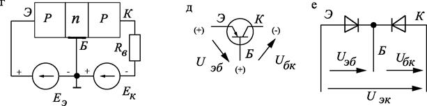 Биполярным транзистором называется полупроводниковый прибор, имеющий два взаимодействующих между собой р-n-перехода. Технология изготовления биполярных транзисторов может быть различной – сплавление, диффузия, эпитаксия, - что в значительной мере определяет характеристики прибора. В зависимости от последовательности чередования областей с различным типом проводимости различают n-p-n-транзисторы и p-n-p-транзисторы. Упрощенное устройство плоскостного n-p-n-транзистора приведено приведено на рис. 1.10а, его условное обозначение – на рис. 1.10 б, а схема замещения – на рис. 1.10 в. Аналогичные представления для p-n-p-транзистора приведены на рис. 1.10 г, д, е. Средняя часть рассматриваемых структур называется базой- Б, одна крайняя область - коллектором- К (накопитель электронов), а другая – эмиттером - Э (источник электронов). В несимметричных структурах электрод базы располагается ближе к эмиттеру, а ширина базы зависит от частотного диапазона транзистора и с повышением частоты уменьшается. Полярность напряжений, приложенных к электродам транзистора, показана на рис. 1.10 в,д.