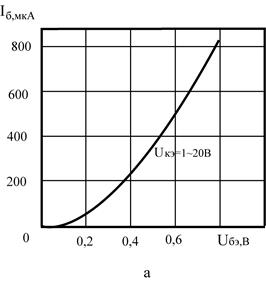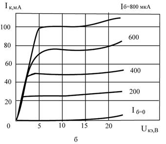 Для анализа работы транзистора и для расчетов схем при больших сигналах часто используют вольт-амперную характеристику (ВАХ) транзистора. На рис. 1.13 показаны типовые ВАХ маломощного биполярного транзистора по схеме включения с ОЭ. Зависимость между током и напряжением во входной цепи транзистора IБ=f1(UБЭ) называют входной или базовой характеристикой транзистора (рис. 1.13,а). Зависимость тока коллектора от напряжения между коллектором и эмиттером при фиксированных значениях тока базы IК=f2(UКЭ)|Iб=const называют семейством выходных (коллекторных) ВАХ транзистора (рис. 1.1.13,б). Входная характеристика практически не зависит от напряжения UКЭ, а выходные приблизительно равноудалены друг от друга и почти прямолинейны в широком диапазоне изменения напряжения UКЭ. Для аналитических расчетов устройств с биполярными транзисторами используют h-параметры транзисторов.