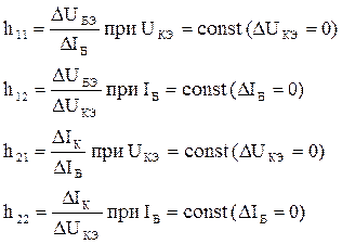 Параметры h могут быть легко определены по входной и выходным характеристикам транзистора с учетом приведенных выше зависимостей. Параметр h11 имеет размерность сопротивления, он представляет собой входное сопротивление биполярного транзистора. Параметр h12 – безразмерный коэффициент внутренней обратной связи по напряжению. Его значения лежат в пределах 0,002 – 0,0002 и в большинстве случаев им можно пренебречь, т.е. полагать равным нулю. Параметр h21 – коэффициент передачи тока, характеризующий усилительные (по току) свойства транзистора при постоянном напряжении на коллекторе. Параметр h22 имеет размерность проводимости и характеризует выходную проводимость транзистора при постоянном токе базы. Характеристики транзистора сильно зависят от температуры. С повышением температуры резко возрастает начальный коллекторный ток IК0 вследствие значительного увеличения количества неосновных носителей заряда в коллекторе и базе. В то же время несколько увеличивается и коэффициент h21 из-за увеличения подвижности носителей заряда. h-параметры транзистора, особенно коэффициент передачи тока h21, зависят от частоты переменного напряжения, при котором производят измерения приращений токов и напряжений ΔIБ, ΔIК, ΔUБЭ, ΔUКЭ, так как на высоких частотах начинает сказываться конечное время, за которое носители заряда (в транзисторе типа n-p-n это электроны) проходят расстояние от эмиттера до коллектора транзистора. Частоту, на которой коэффициент передачи тока h21 уменьшается до единицы, называют граничной частотой коэффициента передачи тока fГР. На практике часто используют частоту f0, на которой параметр h21 уменьшается в
