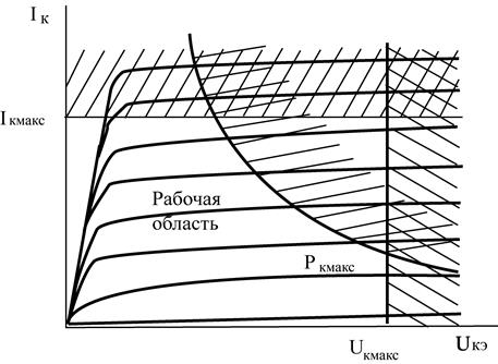 Для предотвращения перегрева коллекторного p-n-перехода необходимо, чтобы его мощность не превышала некоторого максимального значения: PК=IК UКЭ≤PК макс. Таким образом, ограничивающей кривой на коллекторных характеристиках является зависимость IК=PК макс/UКЭ. В целях увеличения допустимой мощности коллектора PК макс в мощных транзисторах коллектор для улучшения теплоотвода соединяют с металлическим корпусом транзистора, а сам транзистор монтируют на специальном радиаторе. Ограничение по допустимой мощности коллектора не является единственным. Если между коллектором и эмиттером приложено слишком высокое напряжение, то может произойти электрический пробой коллекторного p-n-перехода, поэтому необходимо, чтобы при работе транзистора коллекторное напряжение было меньше допустимого: UКЭ≤UКЭ макс. Существует аналогичное ограничение и по коллекторному току IК≤IК макс, которое обусловлено допустимым нагревом эмиттерного перехода. Область, выделенная этими тремя ограничивающими линиями (рис. 1.14), является рабочей областью характеристик транзистора. Из емкости p-n-переходов существенное значение имеет только емкость коллекторного перехода CКБ. Входное сопротивление биполярных транзисторов составляет (10÷100) Ом, выходное (1÷10) кОм. Диапазоны значений остальных параметров отечественных биполярных транзисторов приведены в табл. 1.2.