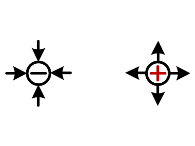 Рис. 1.1. Силы притяжения и отталкивания Атом в целом электрически нейтрален. Если в результате каких-либо действий (нагревание) атом теряет или приобретает электрон, то такой атом становится электрически заряженным, т.е. приобретает электрические свойства. Вещество, приобретая электроны, приобретает отрицательный заряд; при потере электронов вещество приобретает положительный заряд. Движение электронов, или положительных, или отрицательных ионов, от одного вещества к другому, называется электрическим током. В системе СИ количество электричества измеряется в кулонах (Кл). I Кл=6,29.1019 электронов. I Кл также называют I А·сек, т.е. при токе в I A в сек проходит количество электричества I Кл. Вокруг каждой заряженной частицы существует электрическое поле. Электрическое поле обладает энергией, которая проявляет себя в виде сил, действующих на заряженные тела, находящиеся в поле. Электрическое поле изображается в виде силовых линий: