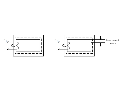 Рис. 4.7. Магнитопровод Магнитный поток в электромагните тем сильнее, чем больше ток и число витков в нем, а также зависит от конструкции магнитопровода. Для увеличения магнитного потока необходимо, чтобы по возможности он проходил не по воздуху, а по ферромагнитному веществу. Величина магнитного потока Φ, создаваемого током, протекающим по катушке, равна: Φ = I · W / Rмаг; где F = I · W - намагничивающая сила, H Rмаг - сопротивление магнитной цепи, Ом Намагничивающая сила "F" является причиной возникновения магнитного потока " Φ ". Магнитное сопротивление играет в магнитной цепи роль, аналогичную электрическому сопротивлению цепи.. С увеличением Rмаг. - магнитный поток уменьшается. Постоянные магниты и электромагниты имеют широкое применение. Работа электромагнитных реле основана на замыкании и размыкании электрических цепей при возникновении и исчезновении магнитного поля. Рассмотрим на примере принцип устройства и схема включения электромагнитного реле:
