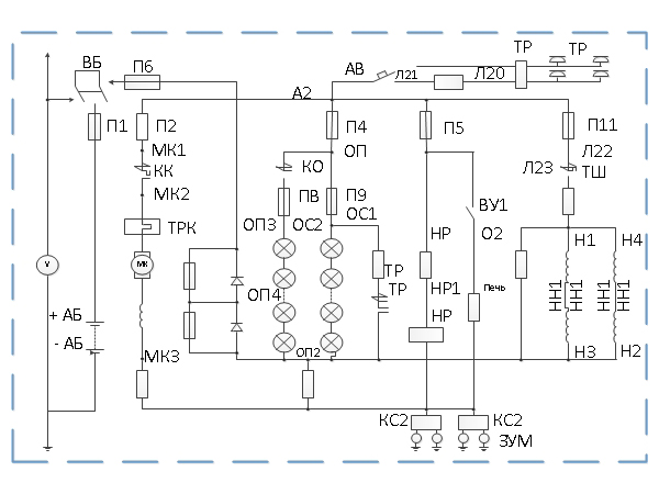 Рис. 6.1. Пример электрической принципиальной схемы Различают следующие принципиальные электрические схемы вагона: силовых цепей, включающих в себя тяговые двигатели и аппараты переключения режимов их работы, через которые проходит тот же ток, что и через тяговые двигатели; цепей управления, включающих в себя устройства и аппараты, которыми осуществляют включения и переключения силовых аппаратов, а также лампы сигнализации о состоянии силовой цепи и положении аппаратов; вспомогательных цепей, в которые включены аккумуляторная батарея, мотор-компрессор, лампы освещения, сигнальные фары, печи отопления, аппараты управления раздвижными дверями и другие вспомогательные аппараты. Ясному представлению о работе подвижного состава, умелой его эксплуатации, быстрому устранению неисправностей во многом способствует умение разбираться в электрических схемах или, как говорят, читать их. Прочитать электрическую схему вагона - значит, проследить по каким путям ток поступает к тяговым двигателям и другим аппаратам. Для этого необходимо знать, какое положение занимают контакты аппаратов, осуществляющих переключение отдельных цепей, так как в зависимости от положения этих контактов (замкнуты они или разомкнуты) некоторые электрические цепи находятся под током, а другие обесточены. Все контакты реле и контакторов обычно изображают в состоянии, в котором они находятся при нулевом положении главной рукоятки и положении "Вперёд" реверсивной рукоятки контроллера машиниста. В соответствии с этим все блокировочные и силовые контакты аппаратов, производящие соединения проводов электрической цепи, подразделяют на размыкающие, т.е. замкнутые при нормальном положении аппарата (при отсутствии тока или внешних сил), и замыкающие, т.е. разомкнутые при этом же положении аппарата. Нормальным считают для индивидуальных контакторов положение отключенное, для групповых переключателей - положение последовательного соединения тяговых двигателей в тяговом режиме (ПС), для реверсора - положение "Вперед". При чтении электрической схемы прежде всего определяют пути прохождения тока. При этом отправной точной в схемах постоянного тока принято считать положительный полюс. Необходимо также иметь ясное представление о том, как устроены аппараты и машины, включённые в цепь. Правила выполнения схем определяются государственными стандартами.