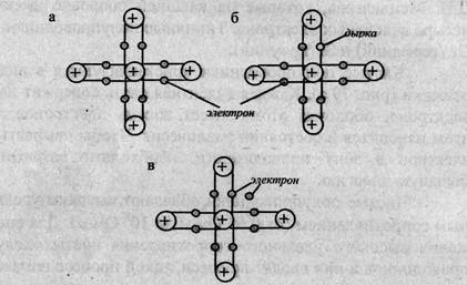 Рис. 79. Фрагмент решетки: а) чистого полупроводника; б) полупроводника с акцепторной примесью; в) полупроводника с донорной примесью Удельное электрическое сопротивление легированного полупроводника существенно зависит от концентрации примесей. При концентрации примесей 1020 ÷ 1021 на 1 см3 вещества оно может быть снижено до 5·10-6 Ом·м для германия и 5·10-5 Ом·м для кремния. Основное значение для работы полупроводниковых приборов имеет электронно-дырочный переход, который называют р-п-переходом (область на границе двух полупроводников, один из которых имеет дырочную, а другой - электронную электропроводность). На практике p-n-переход получают введением в полупроводник дополнительной легирующей примеси. Например, при введении донорной примеси в определенную часть полупроводника р-типа в нем образуется область полупроводника n-типа, граничащая с полупроводником р-типа. Схематически образование p-n-перехода при соприкосновении двух полупроводников с различными типами электропроводности показано на рис. 80. До соприкосновения в обоих полупроводниках электроны, дырки, ионы были распределены равномерно (рис. 80 а).