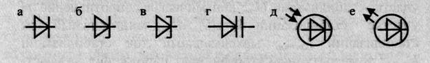 Рис. 85 Условные графические обозначения полупроводниковых диодов: а - вентильного диода; б - стабилитрона; в - туннельного диода; г - варикапа; д - фотодиода; е – светодиода