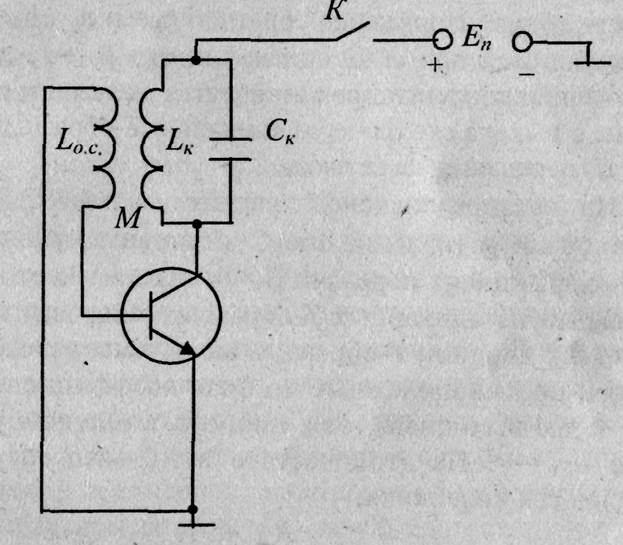 Рис. 108. Структурная схема усилителя с разомкнутой цепью обратной связи (а) и превращение его в автогенератор (б) Коэффициент усиления по напряжению k = Uвых / Uвх, коэффициент обратной связи β = Uо.с / Uвых; Uо.с - напряжение обратной связи. Из выражений для К и β следует, что Uо.с = β Uвых = βk Uвх. Если за счет подбора β добиться, чтобы βk = 1, то Uo.c = Uвх. Если при выполнении этих условий отключить напряжение Uвх от постороннего источника и подключить на вход усилителя Uо.c = Uвх, то усилитель будет в тех же условиях, в каких он находился, когда на его вход подавалось напряжение от постороннего источника, и, таким образом, усилитель превращается в автогенератор. Выполнение условия Uo.c = Uвх называется выполнением условия баланса амплитуд. Кроме выполнения этого условия для превращения усилителя в автогенератор необходимо также выполнение условия баланса фаз, при котором напряжение Uo.c совпадает по фазе с напряжением Uвx. При этом потери энергии в автогенераторе восполняются через цепь обратной связи от источника питания автогенератора. Колебания на выходе схемы поддерживаются в такт (в фазе) колебаниям, поступающим на вход через цепь обратной связи. При β < 1 / k напряжение на входе через цепь обратной связи окажется слишком малым и колебания на входе прекратятся. При β > 1 / k напряжение на выходе будет возрастать до тех пор, пока нелинейность вольт-амперной характеристики усилителя не приведет к уменьшению k до значения, при котором будет выполняться условие Uо.c = Uвх. Если условия баланса амплитуд и фаз выполняются для одной частоты, автогенератор будет генерировать гармонические колебания. Если условия выполняются для полосы частот, то в генераторе будут возникать несинусоидальные колебания. При использовании в генераторе LC колебательного контура образуются LC-автогенераторы, работающие на высоких частотах. В случае применения в качестве элементов схемы резисторов и конденсаторов образуются RC-автогенераторы, используемые для генерирования низких частот. На рис. 109 показана упрощенная схема LC-авто-генератора синусоидальных колебаний с индуктивной обратной связью. Она состоит из транзистора типа п-р-п, колебательного контура LKCK, катушки обратной связи Lо.c и источника питания Еп. При замыкании ключа К напряжение источника питания вызывает коллекторный ток, который из-за индуктивности катушки LK будет нарастать постепенно, при этом заряжается конденсатор Ск. В генераторе используется контур с малыми потерями, т.е. с высокой добротностью, поэтому разряд конденсатора через катушку LK будет носить колебательный характер. Переменный ток в контуре через взаимоиндукцию М возбудит напряжение в катушке обратной связи Lк, которое попадет на базу транзистора и вызывает пульсацию тока базы и коллекторного тока. Переменная составляющая коллекторного тока создаст переменное напряжение на колебательном контуре, которое при выполнении условий баланса фаз и амплитуд превратит колебания в контуре в незатухающие.