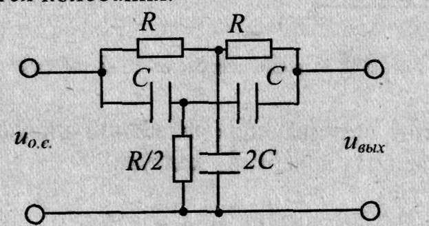 При необходимости построения автогенераторов в диапазоне низких частот использование LC-колебательных контуров нецелесообразно, так как такие контуры становятся громоздкими и имеют добротность меньшую, чем необходимо для самовозбуждения генератора. Генераторы самовозбуждения низкой частоты строят по другим схемам и в качестве цепей обратной связи используют элементы в виде резисторов и конденсаторов. В схеме RC-автогенератора с двойным Т-образным мостом (рис. 110) на очень низких частотах, при ω → ∞ коэффициент обратной связи β→ 1, так как сопротивления конденсаторов становятся большими и все напряжение ивых через один «верхний» Т-образный мост (R, 2C, R) передается на вход в виде напряжения обратной связи ио.с. На очень высоких частотах при ω → ∞ коэффициент β→ 1, так как сопротивления конденсаторов становятся малыми и все напряжение с выхода схемы через «нижний» Т-образный мост (С, R/2, С) передается на ее вход. На квазирезонансной частоте ω = 1/RC (когда реактивное сопротивление 1/ω0С становится равным R) общий коэффициент передачи β = 0, так как на этой частоте каждый из одинарных Т-образных мостов, из которых состоит двойной Т-образный мост, имеет равные по модулю и противоположные по фазе коэффициенты передачи и их выходные токи взаимно компенсируются, так что ио.с = 0. На этой частоте в RС-автогенераторе возбуждаются колебания.