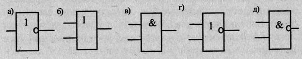 Рис. 111. Условные обозначения логических элементов: элемента «НЕ» (а); элемента «ИЛИ» (б); элемента «И» (в); элемента «ИЛИ-НЕ» (г); элемента «И-НЕ» (д) Операция «ИЛИ» (логическое сложение или дизъюнкция) обозначается символами «+» или V, аналитически записывается как Y = X1 + X2 +... + Xn или Y = Xl V X2 V...V Xn. Таблица истинности при двух аргументах имеет вид: