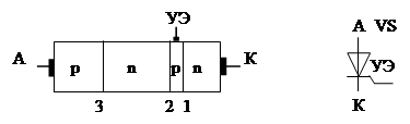 Рис.22. Технологическая структура и условное обозначение тиристора; А – анод, К – катод, УЭ – управляющий электрод.