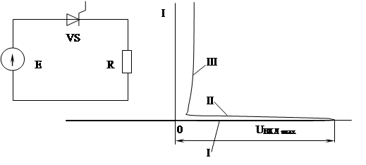 Рис.24. Схема включения тиристора в режиме обратного смещения 2-го p-n перехода и ВАХ при достижении напряжения его пробоя.