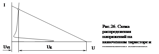 На рис.25 показана эквивалентная схема тиристора в виде резистивного делителя напряжения, сопротивления которого зависят от тока через них.. Она позволяет легче понять принцип работы тиристора. При напряжениях меньше пробойного из-за большого сопротивления 2-го p-n перехода, находящегося под обратным смещением, практически все напряжение источника Е падает на нем. Следовательно, на 1-м и 3-м p-n переходах, падает незначительное прямое напряжение, соответствующее обратному току 2-го p-n перехода. При реальных обратных токах прямое падение напряжений на 1-м и 3-м p-n переходах около 20-30 мВ. Ток через тиристор равен обратному току 2-го перехода, участок I, рис.24.