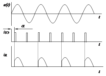 Рис.27. Схема управляемого однополупериодного выпрямителя с использование тиристора и диаграммы переменной ЭДС e(t), управляющего тока iУЭ, выпрямленного тока iR; a - угол управления.