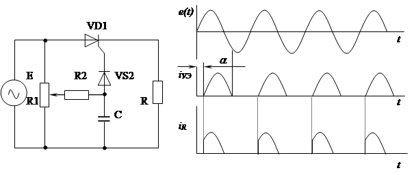 Рис.28. Однополупериодный выпрямитель с регулированием выпрямленного тока с помощью фазосдвигающей RC цепочки и диаграммы выпрямляемой ЭДС e(t), управляющего тока iУЭ, выпрямленного тока iR.