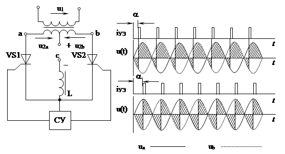 Рис.29. Схема однофазного двухполупериодного ведомого сетью инвертора в режиме выпрямления и временные диаграммы напряжения при фиксированных углах управления