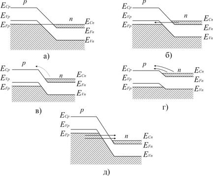 Как известно, в вырожденных полупроводниках уровень Ферми располагается в разрешенной зоне: в полупроводнике р -типа проводимости в валентной зоне, а в п -типа – в зоне проводимости. Это обуславливает появление свободных от электронов состояний в валентной зоне р -типа полупроводника и занятых электронами состояний в зоне проводимости полупроводника п -типа. В энергетических диаграммах рисунка 2.5 занятые электронами состояния заштрихованы, а свободные состояния не заштрихованы. Как видно из рисунка 2.5, а, при равновесии перехода свободные и занятые электронами состояния р - и п - областей располагаются друг против друга. Поэтому, электроны практически не могут совершать туннельные переходы в обоих направлениях, так как для электронов зоны проводимости п -области отсутствуют в р -области свободные состояния, а в свободных состояниях р - области нет электронов для туннельного перехода. В результате при равновесии (V =0) туннельный ток равен нулю (рис.2.4, точка а).