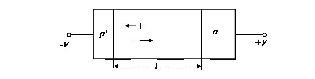 Рис.2.9. Структура лавинно-пролетного диода р+-п перехода, являющегося основой лавинно-пролетного диода.. Возникающие при пробое перехода электронно-дырочные пары движутся в области объемного заряда (область шириной l) в сильном электрическом поле (более 5000 кВ/м). При такой напряженности поля скорость дрейфа электронов практически перестает расти с ростом напряженности электрического поля. Это насыщение скорости вызывает сдвиг фаз между током и переменным напряжением, прикладываемым к диоду. Из-за несимметричности перехода увеличивается время пролета электронов через область объемного заряда до низкоомной п -области, что также вызывает отставания тока от приложенного напряжения во времени. Другой причиной появления фазового сдвига является инерционность развития лавинного пробоя. Выбором режима и ширины области объемного заряда можно добиться сдвига фазы между током и напряжением на некоторой высокой частоте переменного напряжения на 180°, т.е. нарастанию напряжения при этом соответствует уменьшение тока. Таким образом, возникает дифференциальное отрицательное сопротивление. Это позволяет использовать такие диоды в качестве генераторов СВЧ-колебаний. Лавинно-пролетные диоды изготавливают из германия, кремния и арсенида галлия. Их рабочие частоты достигают сотен гигагерц при мощности колебаний до десятков ватт в импульсе. Недостатками таких диодов являются: - низкий КПД, что обусловлено узким диапазоном амплитуды переменного напряжения, при котором существует отрицательное сопротивление; - высокая нестабильность параметров генерируемых колебаний из-за высокого уровня шумов, присущий механизму лавинного пробоя перехода. Поэтому лавинно-пролетные диоды, в основном, находят применение для разработки на их основе высокоэффективных генераторов шума в СВЧ диапазоне.