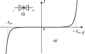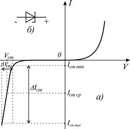 Рис.2.10. Вольтамперная характеристика стабилитрона общего назначения а) и его условно-графическое обозначение б).