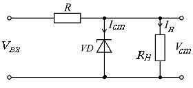 основе стабилитрона общего применения. Резистор Rогр используется для задания рабочей точки стабилитрона и одновременно ограничивает ток через стабилитрон. При изменении тока нагрузки Iн или входного напряжения Vвх падение напряжения на этом резисторе происходит таким образом, что напряжение на стабилитроне и, тем самым на нагрузке, остается практически постоянным и равным напряжению стабилизации стабилитрона Vcm.