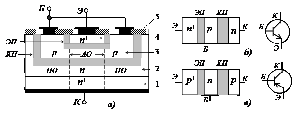 3.2. Устройство и обозначение биполярного транзистора Биполярный транзистор - это трехэлектродный полупроводниковый прибор с двумя взаимодействующими электронно-дырочными переходами, включенными встречно друг другу. Структурно он представляет собой трехслойный полупроводниковый монокристалл с чередующимся типом электропроводности. Биполярные транзисторы изготавливаются из кремния Si и германия Ge. Существуют транзисторы n-р-п -структуры и р-n-р -структуры. Левую крайнюю область транзистора, изготовленного из полупроводника с высокой концентрацией носителей тока, называют эмиттером (Э). Эмиттер является источником носителей тока в транзисторе. Правую область с сравнительно низкой концентрацией носителей тока называют коллектором (К). Коллектор собирает носителей тока. Область между эмиттером и коллектором называется базой (Б). Переход м ежду эмиттером и базой называется эмиттерным переходом (ЭП), амежду коллектором и базой- коллекторным переходом (КП). На рис. 3.1,а показана структура кремниевого биполярного транзистора п- р-п -типа, изготовленного с использованием методов литографии по эпитаксиально-планарной технологии, которая характерна для большинства современных транзисторов. На сильнолегированной подложке (1) n +-типа проводимости методом эпитаксиальной технологии сформирован слаболегированный слой (2) n -типа толщиной около 10 мкм, в котором методом локальной диффузии примесных атомов акцепторного типа создан слой базы (3) с дырочной электропроводностью р -типа и повторной локальной диффузией примессных атомов донорного типа - слой эмиттера (4) n +-типа. Толщина базового слоя составляет около 1 мкм. На поверхности кристалла расположен защитный слой диоксида кремния Si02 (5) толщиной менее 1 мкм, через окна в котором осуществлены металлические выводы от эмиттера и базы. Тонкая база