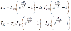 где Система уравнений (4.23) и представляют собой расчетные вольтамперной характеристики эмиттерного и коллекторного токов транзистора. Отметим, что эти уравнения справедливы только при низких уровнях инжекции, когда число инжектированных в базу электронов значительно меньше, чем число дырок - основных носителей тока в базе. Кроме того, эта система уравнений справедлива для любой схемы включения транзистора и при его работе в любом режиме.