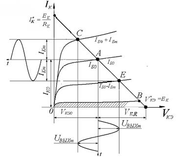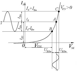 Так как входные характеристики транзистора в нормальном активном режиме слабо зависят от напряжения VКЭ, то можно считать, что рабочая точка, определяющая ток базы в любой момент времени, перемещается по одной входной характеристике вверх и вниз в определенных пределах. При этом периодическое изменение базового тока приближенно можно представить выражением