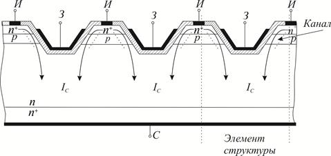 Мощные МДП-транзисторы бывают двух типов, которые отличаются технологией их изготовления. К первому типу относится МДП-транзистор, изготовленный методом двойной диффузии – ДМДП-транзистор, который характеризуется коротким каналом, расположенным горизонтально. Малое сопротивление канала обеспечивается параллельным соединением каналов отдельных структур. На рисунке 11.1 приведена структура такого транзистора. Для изготовления таких транзисторов, как видно из рисунка, на поверхности высокоомной положки из кремния п типа проводимости методом последовательной двойной диффузией создаются ячейки р-п+ типа. Затем формируются выводы МДП затвора и истока, а с нижней стороны подложки – общий вывод стока. Как видно из рисунка, отдельные элементы структуры транзистора расположены вертикально, ток стока течет перпендикулярно к поверхности, а каналы проводимости расположены горизонтально.