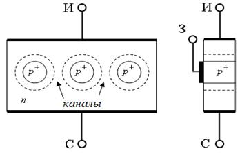 а) б) Рис.11.3. Структура СИТ-транзистора вид спереди а) и вид сбоку б)