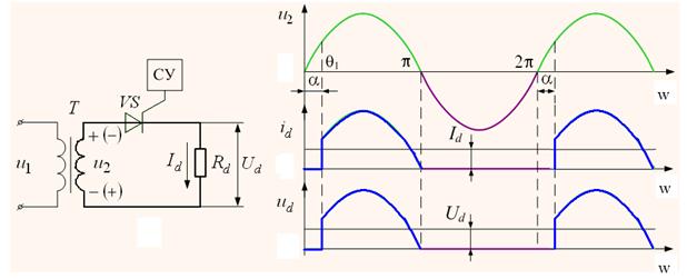 Простейшей схемой управляемого выпрямителя является однофазная однополупериодная схема.