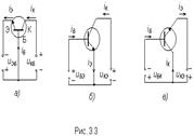 В большинстве электрических схем транзистор используется в качестве четырехполюсника, то есть устройства, имеющего два входных и два выходных вывода. Очевидно, что, поскольку транзистор имеет только три вывода, для его использования в качестве четырехполюсника необходимо один из выводов транзистора сделать общим для входной и выходной цепей. Соответственно различают три схемы включения транзистора: схемы с общей ба зой (ОБ), общим эмиттером (ОЭ) и общим коллектором (ОК). В схеме с общей базой (см. рис. 3.3,а)